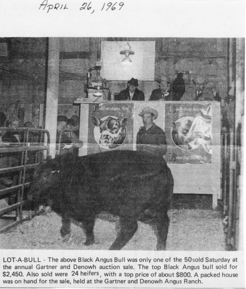In 1950 Russell Denowh married Patricia Gartner, the oldest daughter of Joe Gartner, and the young couple moved to Sidney to farm with Joe in 1951. Joe and Russ bought their first Angus bull in 1953. Gartner-Denowh Angus Ranch was born in 1957 when Joe and Russ bought twenty head of registered Angus cows from a dispersion sale in Montana. Since then the ranch has grown, but the philosophy behind it hasn't changed. The main focus is still to raise efficient and functional cattle bred for the commercial cattle operation.